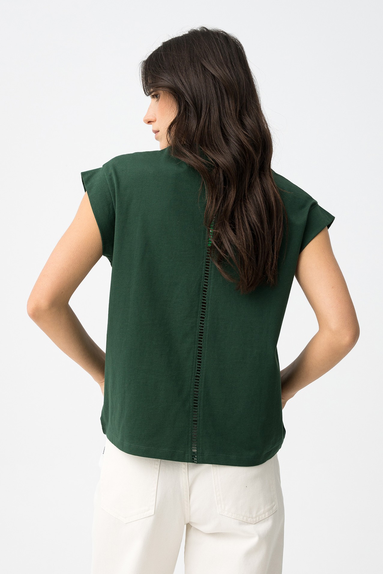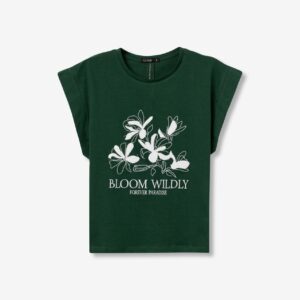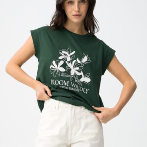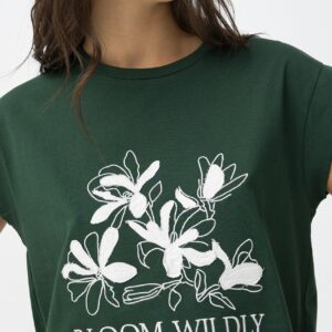 T-shirt verde de manga curta com estampado floral branco e corte regular, costas com detalhe costurado.