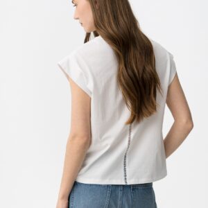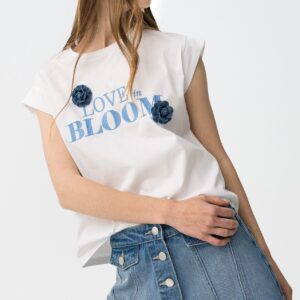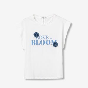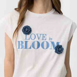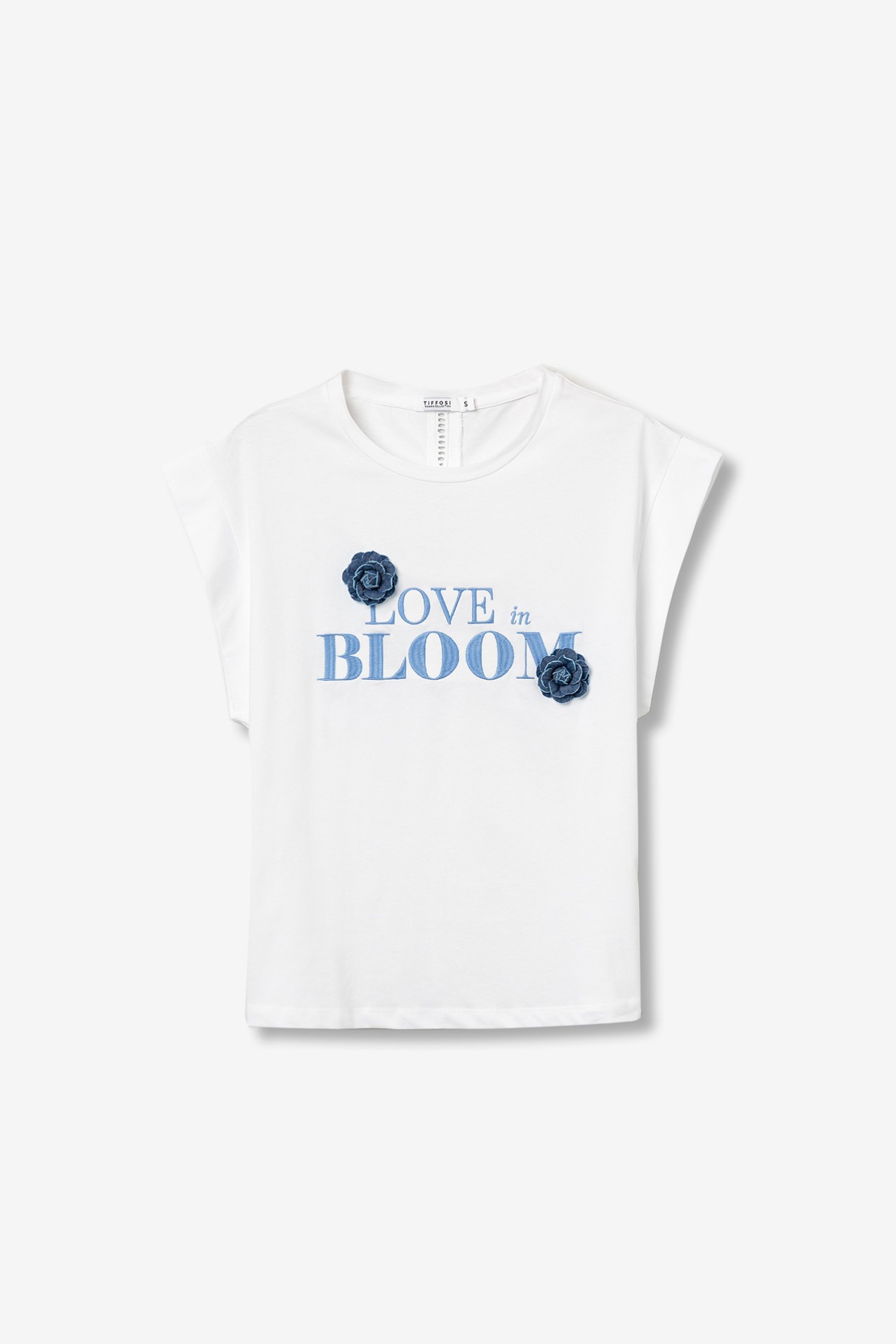 T-shirt branca com mangas curtas e estampado ‘Love in Bloom’ em azul, corte regular.
