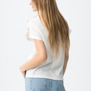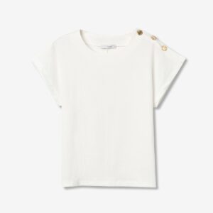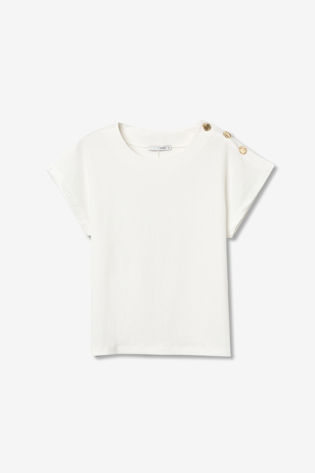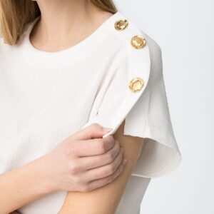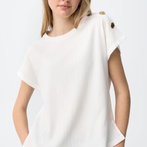 T-shirt de corte largo em cor branca, manga curta, botões dourados decorativos no ombro esquerdo.