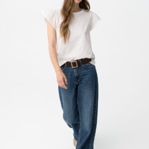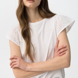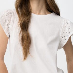 T-shirt de cor branca com mangas curtas rendadas, corte regular e estilo casual chic.
