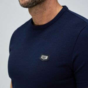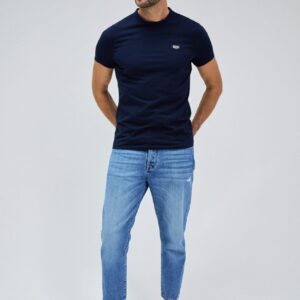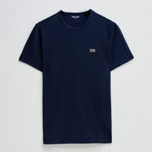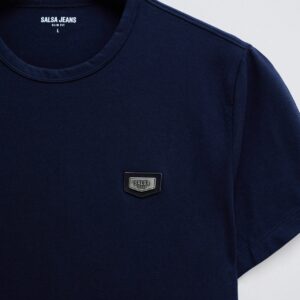 T-shirt slim fit em algodão, ideal para um look descontraído mas cuidado. O decote em V e as mangas curtas destacam a silhueta com simplicidade. O detalhe metálico com branding no peito acrescenta um toque moderno. Um essencial versátil para combinar com os teus jeans favoritos.