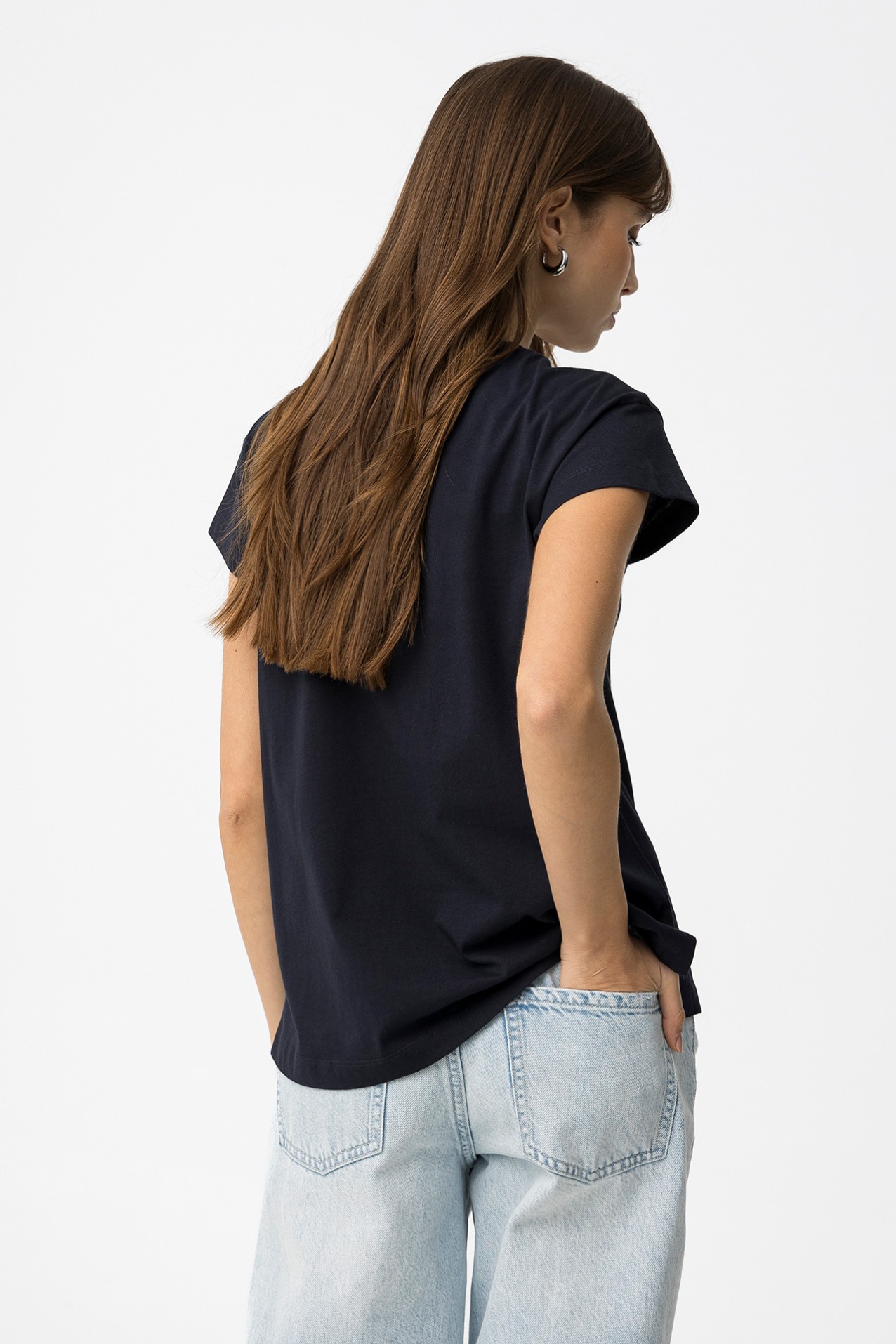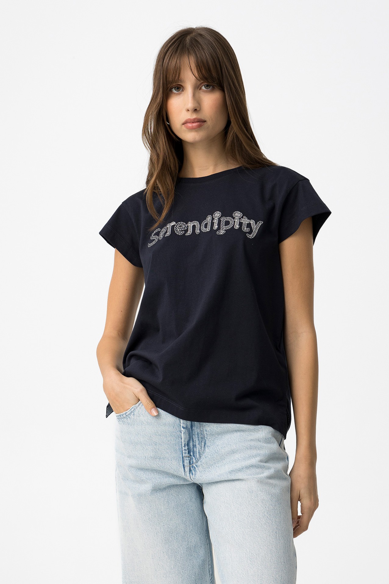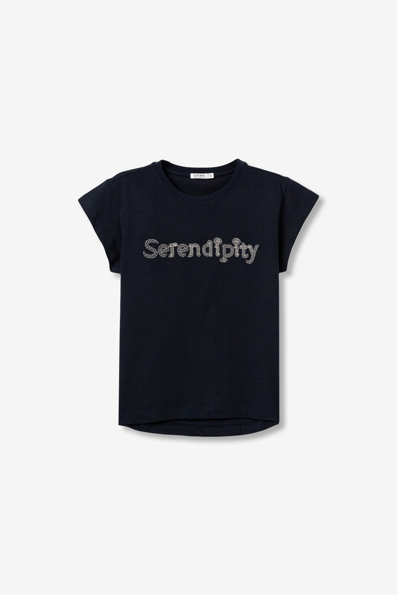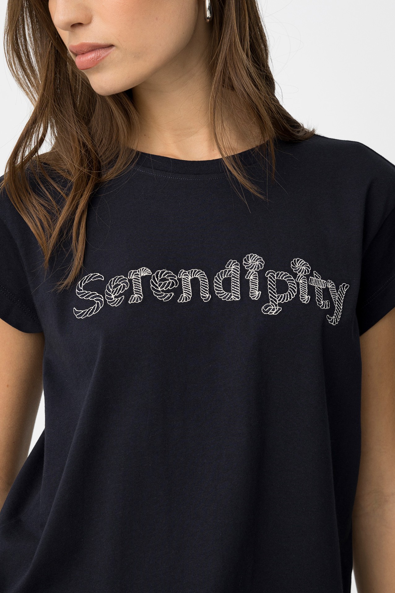 T-shirt de cor azul escuro, corte regular, manga curta e lettering Serendipity estampado à frente.