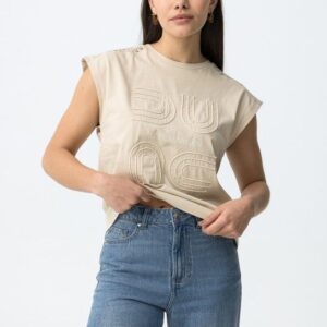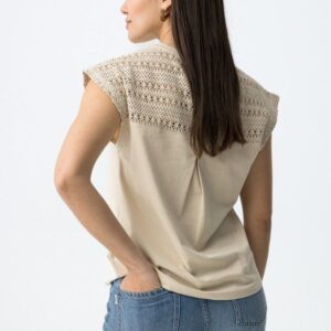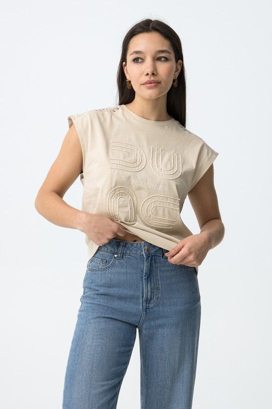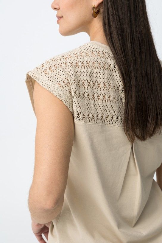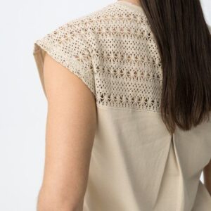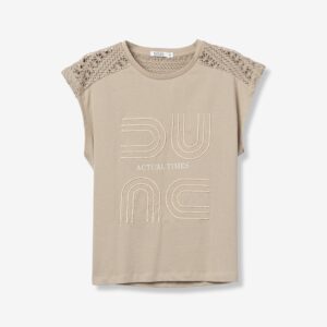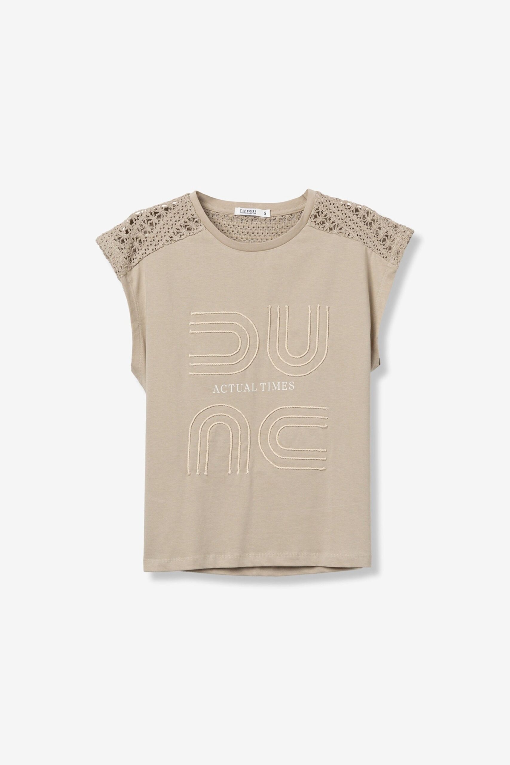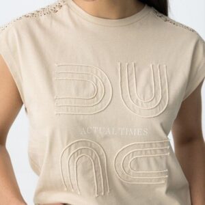 T-shirt de cor bege com corte straight, detalhe de renda nos ombros e lettering bordado à frente.