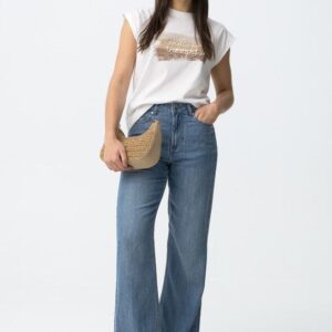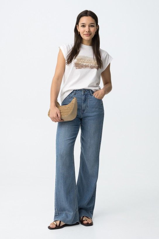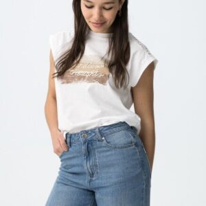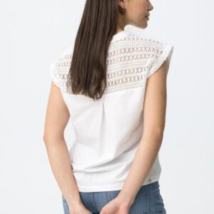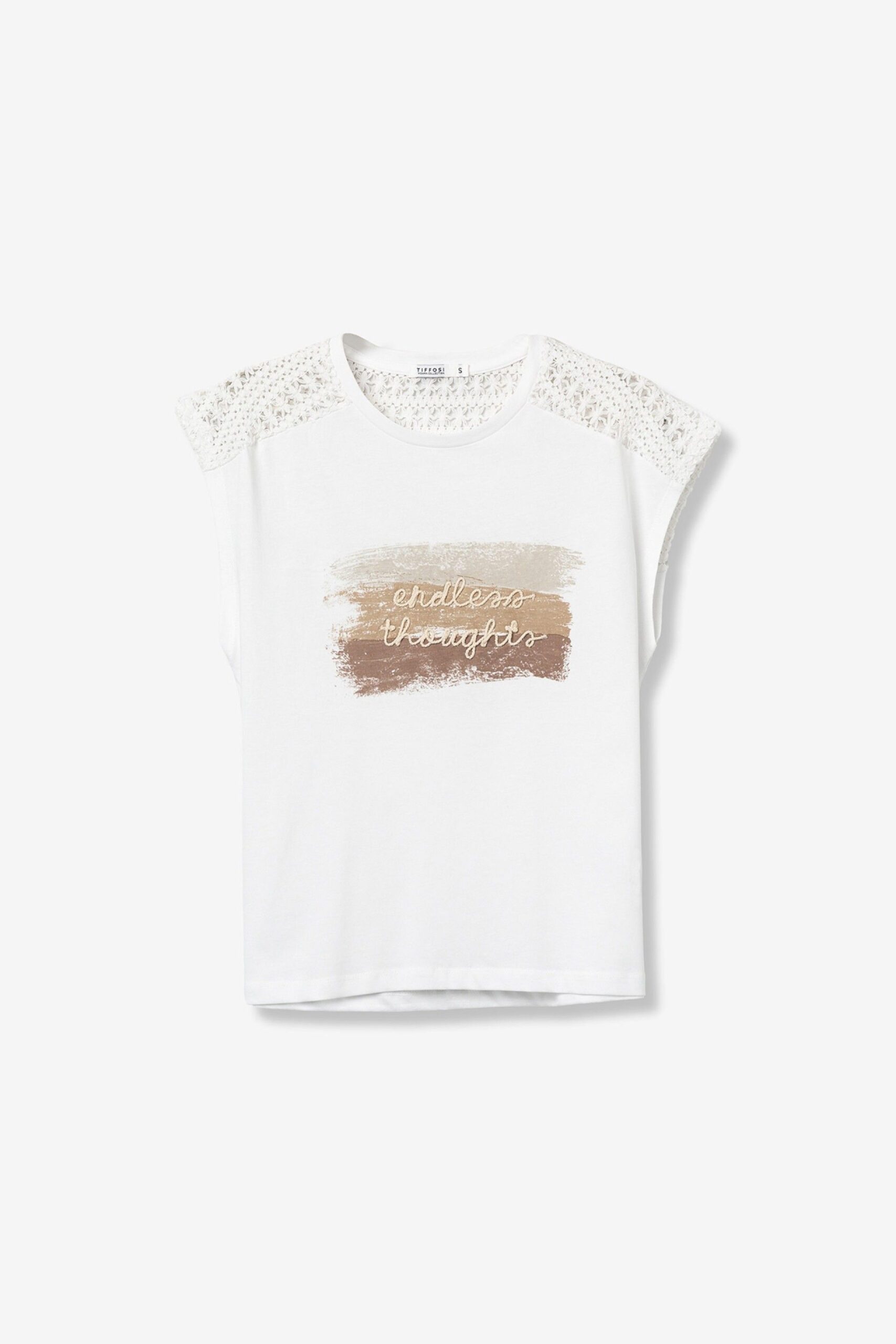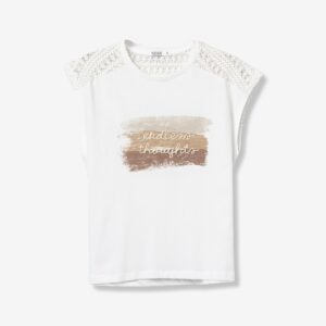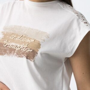T-shirt de cor branca, corte regular, com detalhe em renda nos ombros e print frontal em tons neutros.