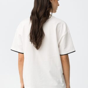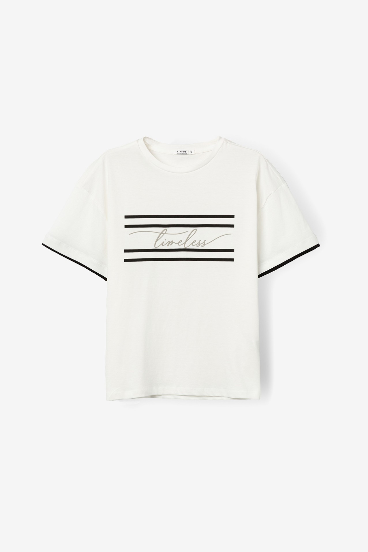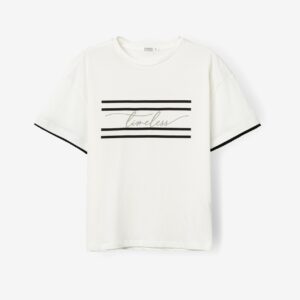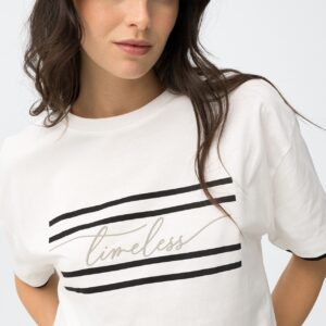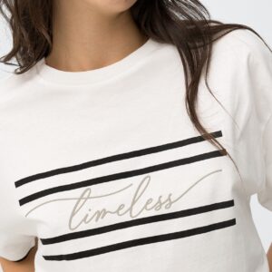 T-shirt branca relaxed com mangas curtas e detalhe de riscas pretas e palavra ‘timeless’.