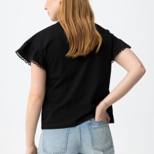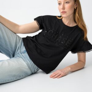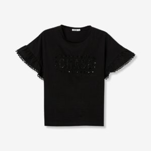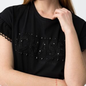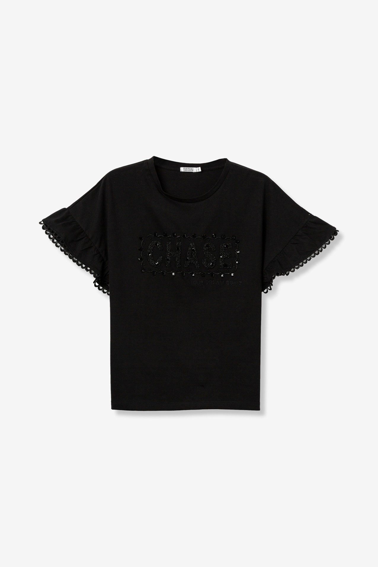 T-shirt de cor preta, corte regular, manga curta com detalhe rendado e aplicação CHASE em relevo brilhante.