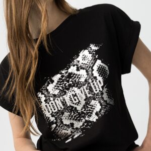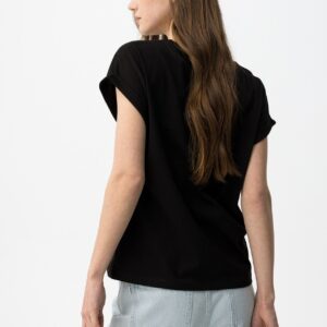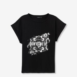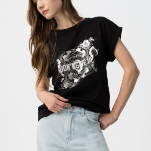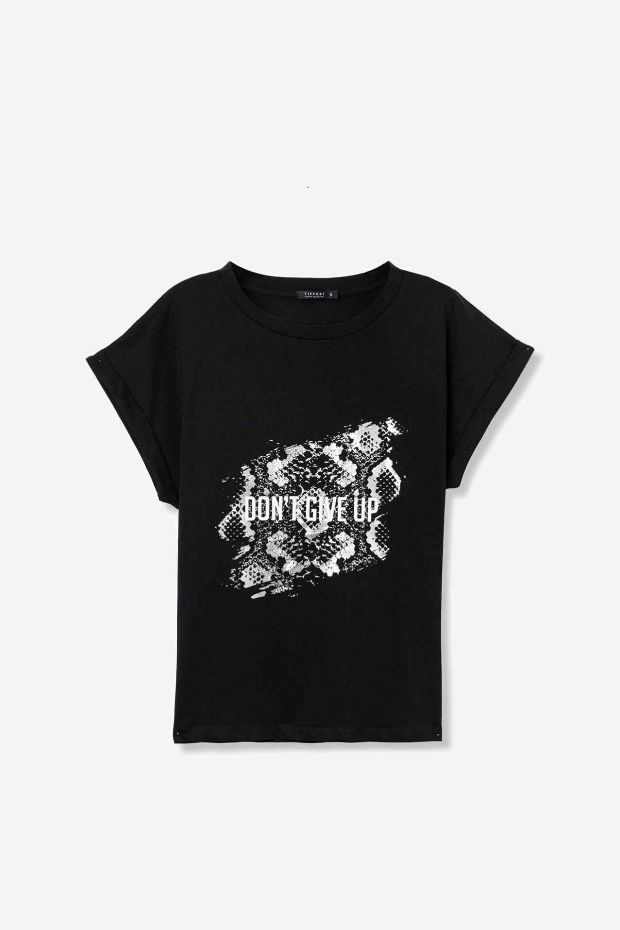 T-shirt de cor preto, corte regular, manga curta dobrada e print metálico com lettering na frente.