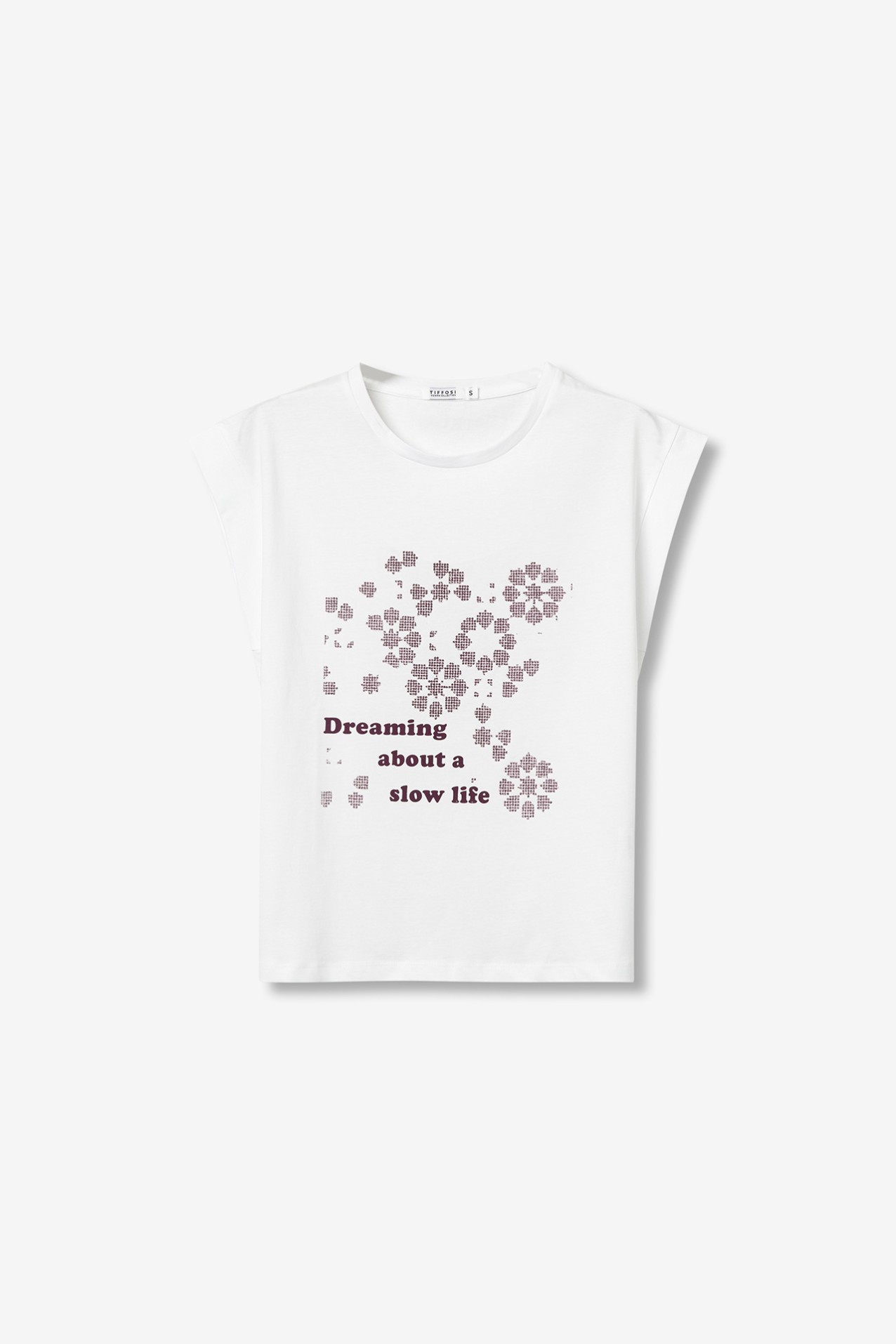 T-shirt branca com mangas curtas e estampa floral, corte regular e vibe descontraída.
