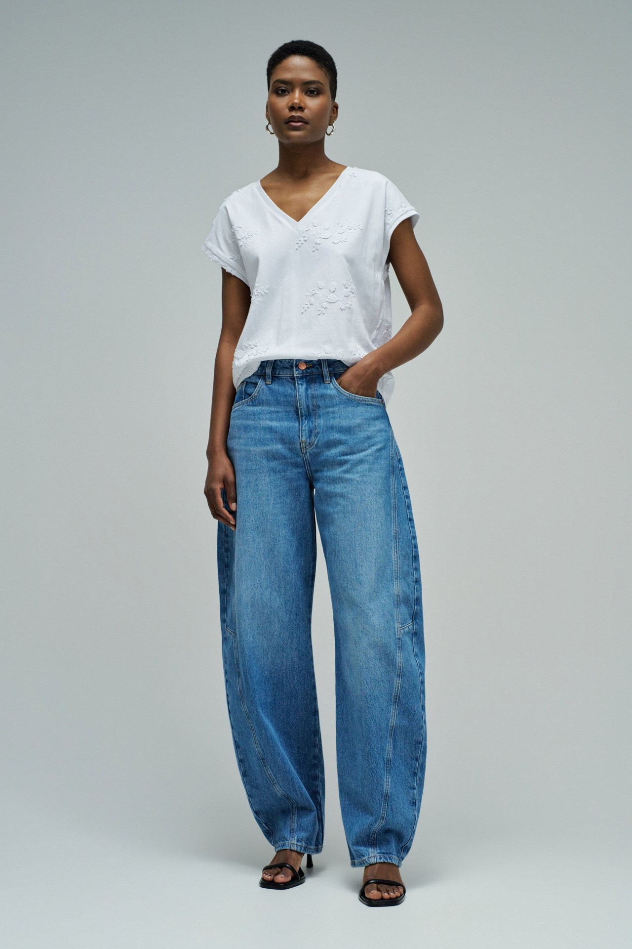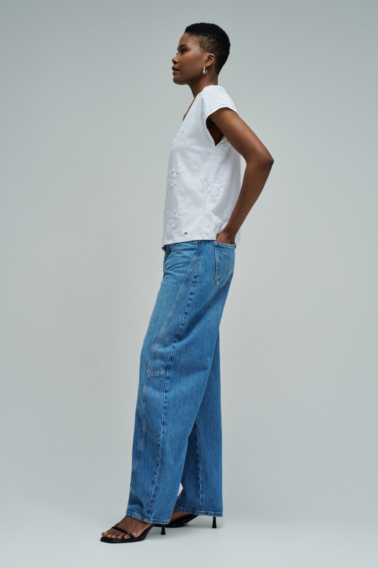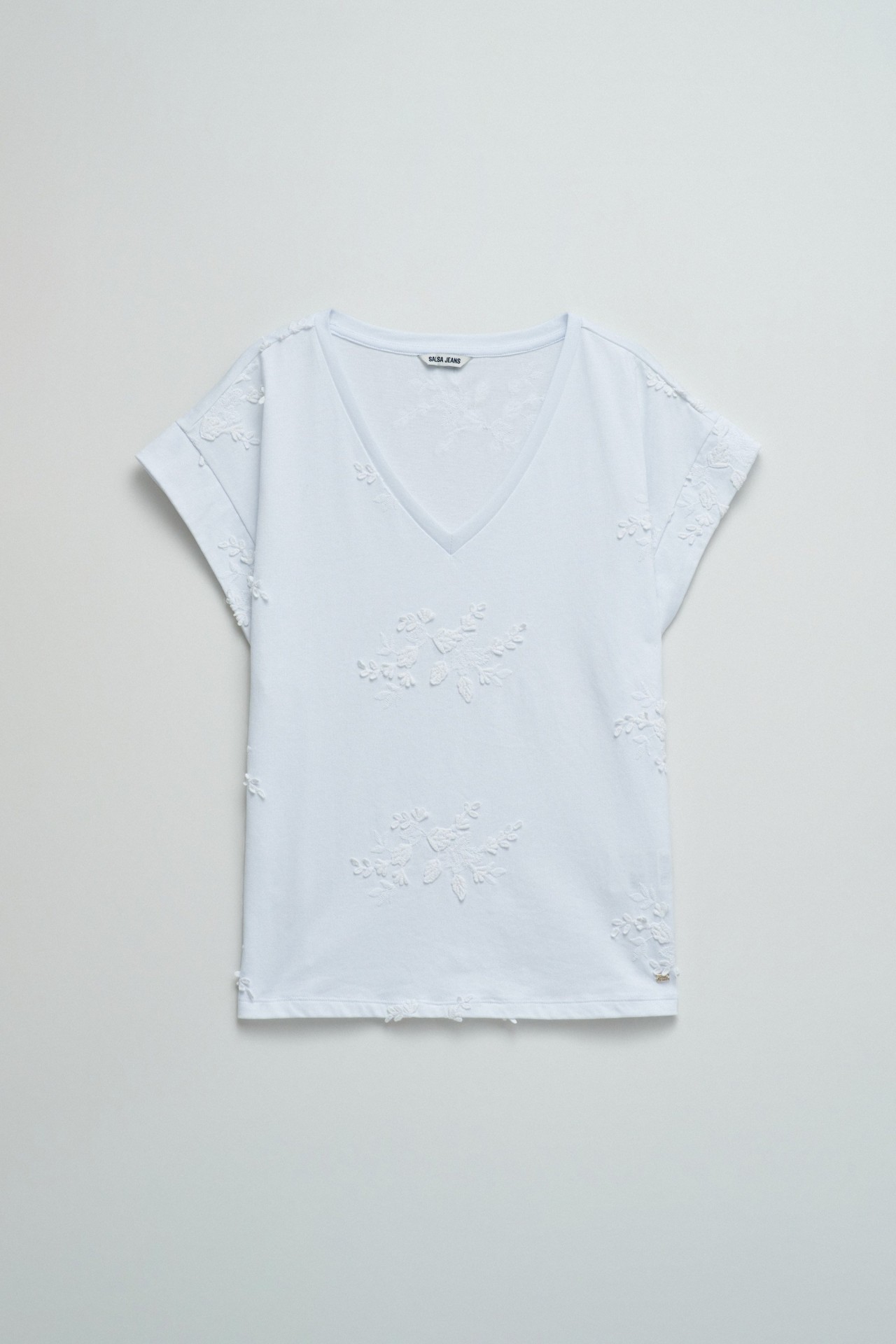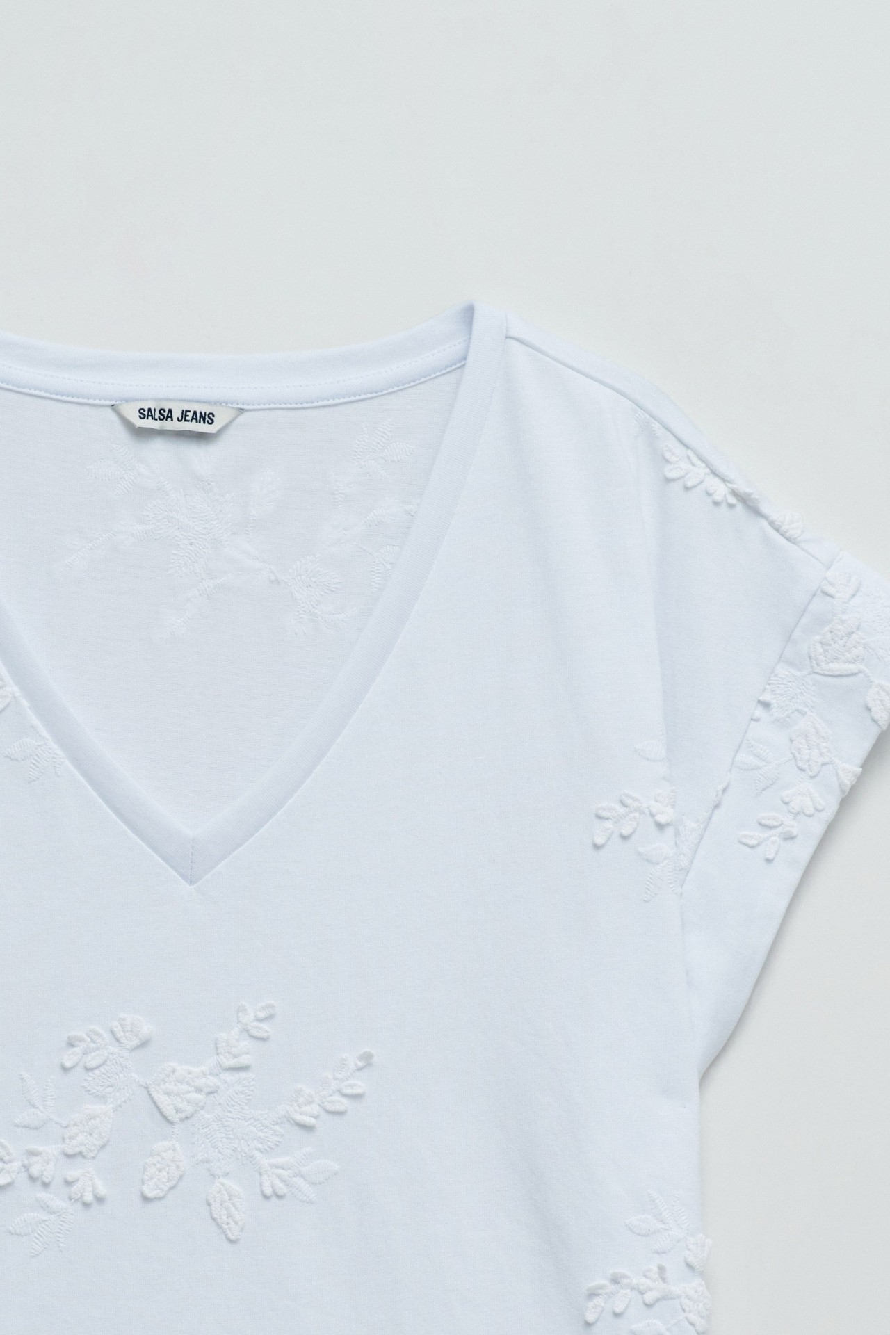 T-shirt branca com bordados florais que acrescentam um toque delicado e feminino à peça. O fit regular garante conforto e versatilidade no dia a dia, enquanto as mangas curtas e o decote em V criam uma silhueta leve e favorecedora. Ideal para combinar com denim ou peças mais fluidas, trazendo frescura e romantismo aos looks casuais.