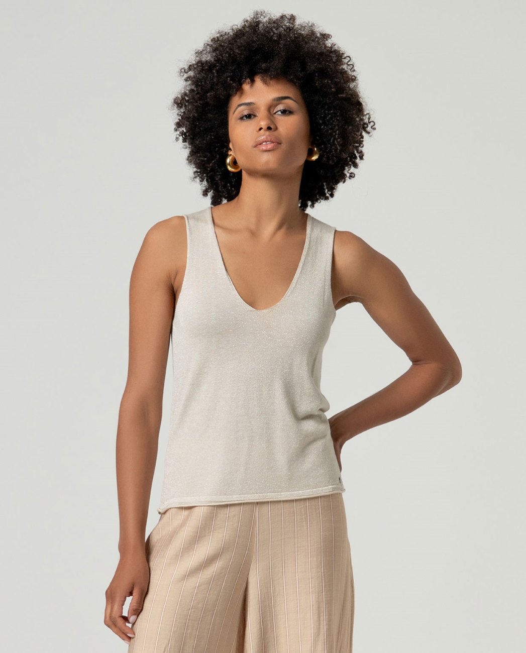 Regata com decote em V na frente e atrás. Design de silhueta reta com acabamentos limpos e estrutura simples. Feito de tecido fino e simples com fio de lurex. Projetado em Barcelona.