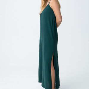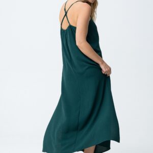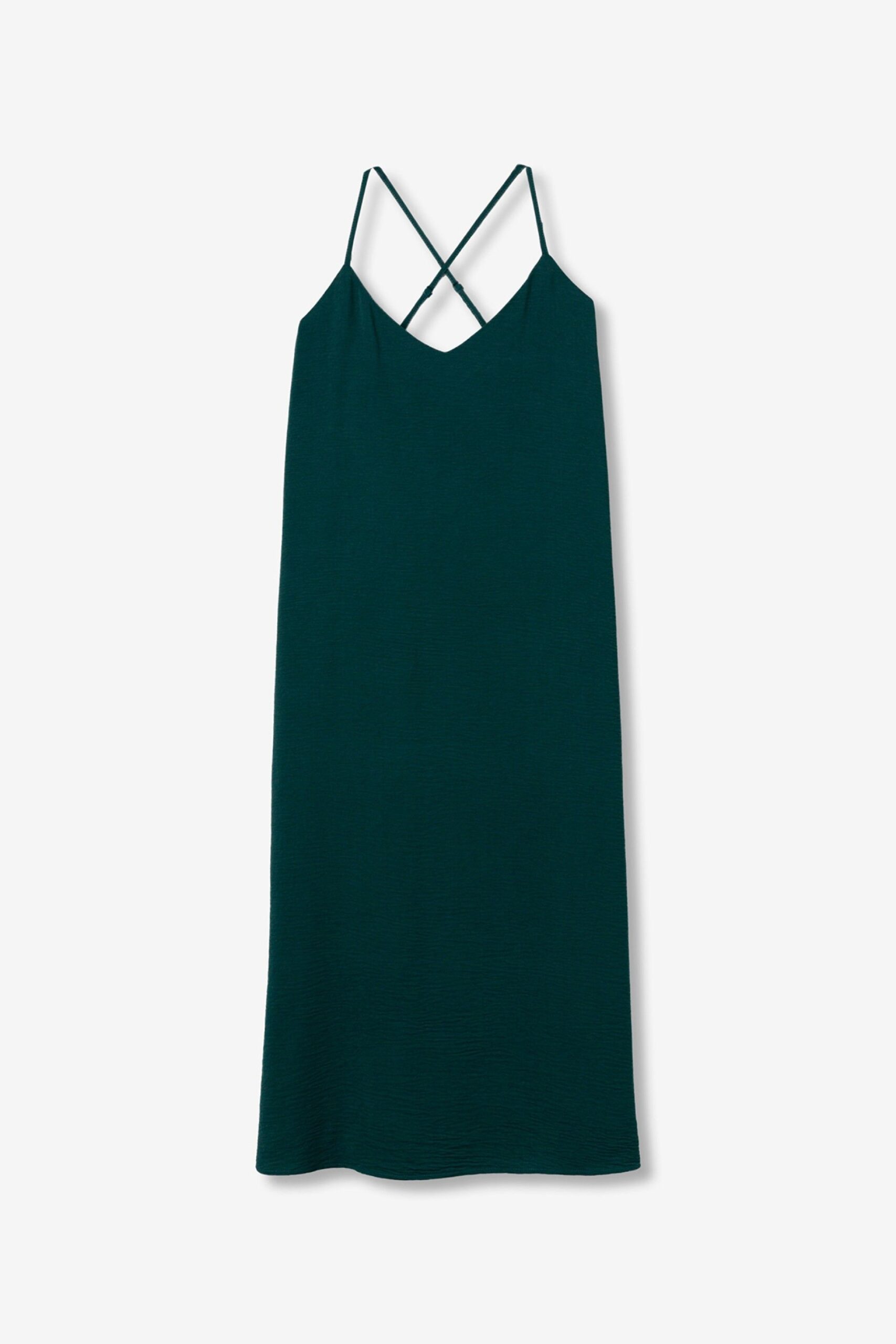 Vestido slim de cor verde escura, com alças finas cruzadas nas costas e corte minimalista.