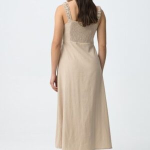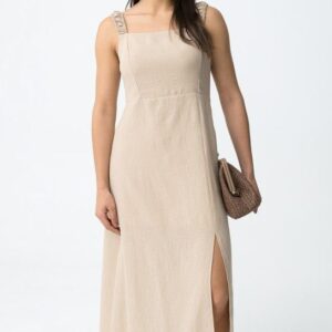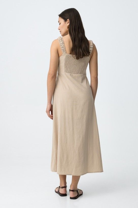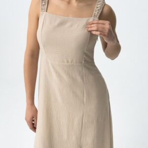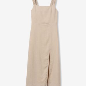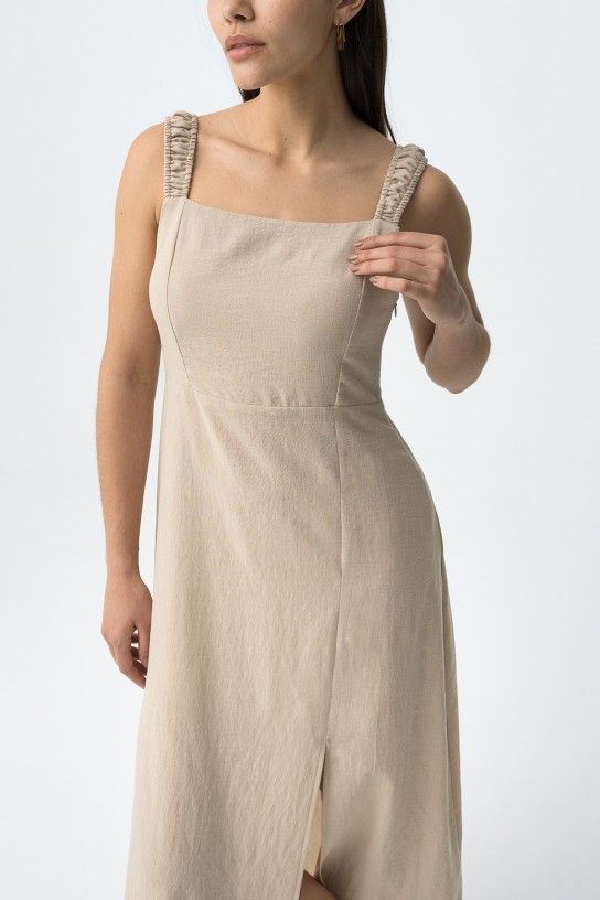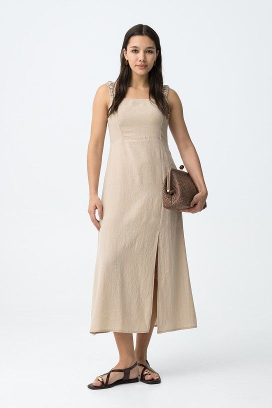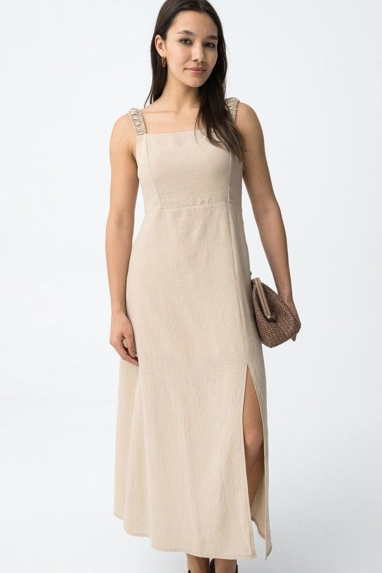 Vestido bege de corte regular, alças franzidas e racha frontal, vibe minimalista e descontraída.