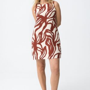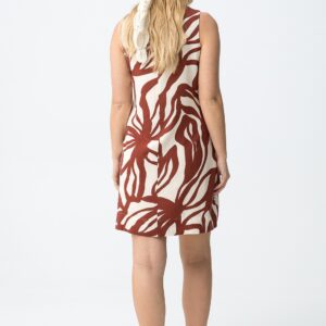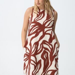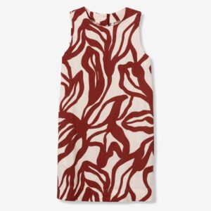Vestido de corte reto, sem mangas, em bege com padrão de folhas em tom castanho avermelhado.