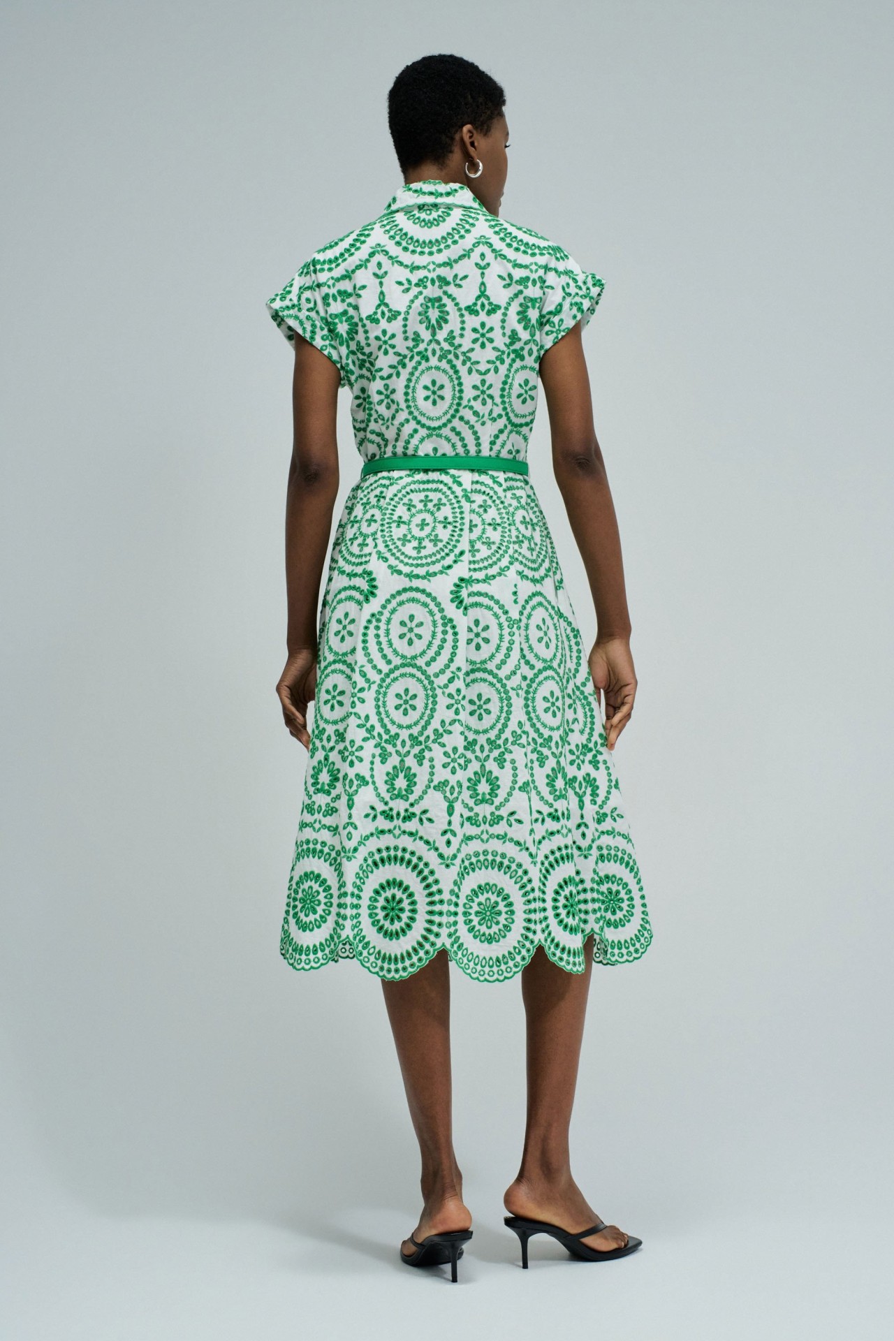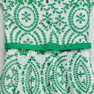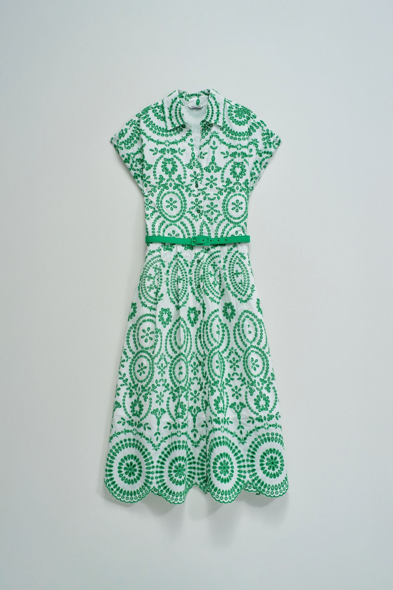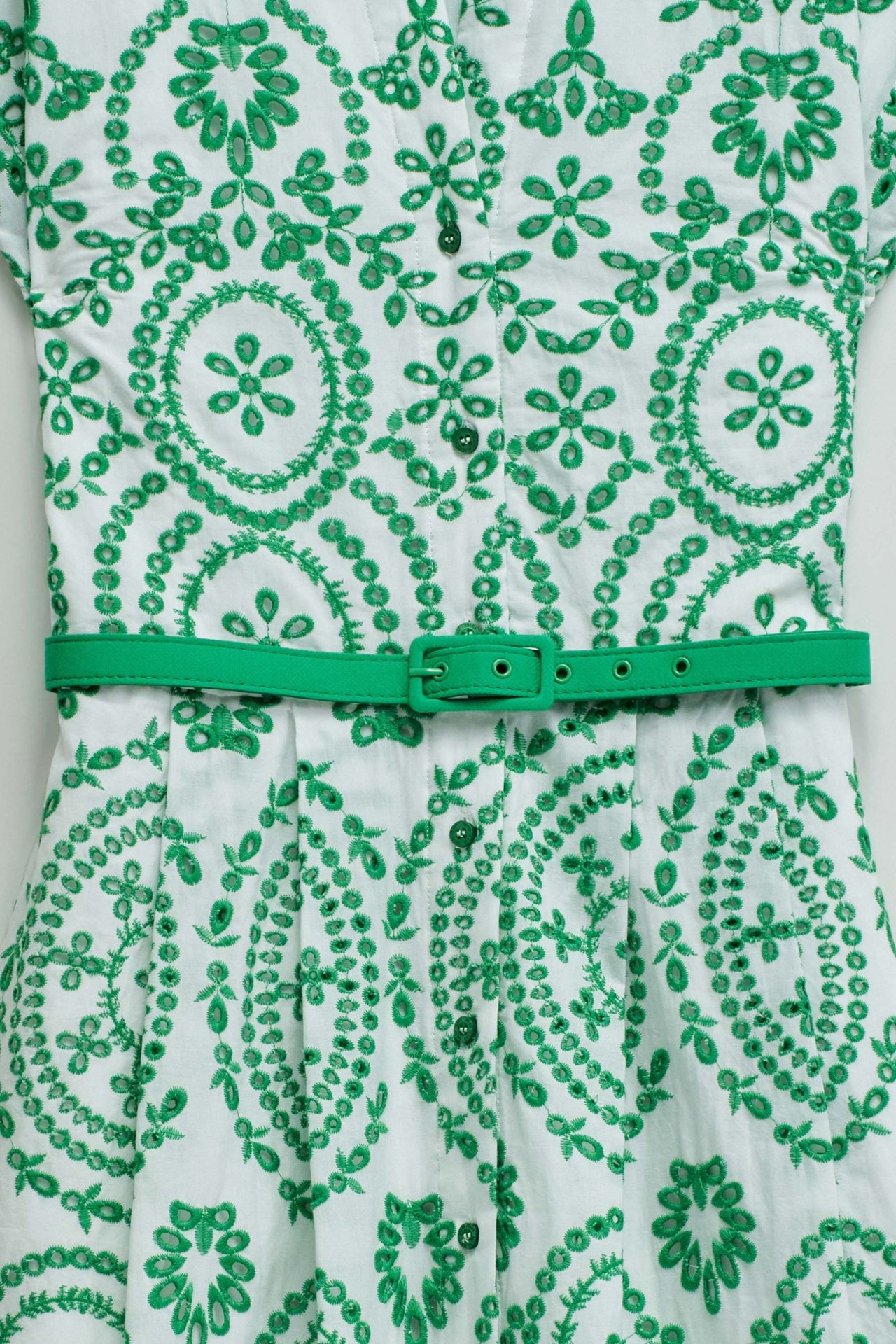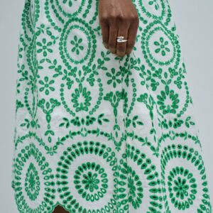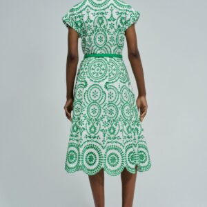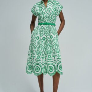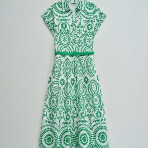As flores assumem protagonismo e os tecidos tornam-se mais leves. Este vestido camiseiro em bordado inglês reflete essa inspiração através de um padrão floral vibrante e de uma silhueta fresca, pensada para os dias mais quentes.O bordado inglês destaca-se pela textura delicada e pelo toque respirável, proporcionando conforto e leveza ao longo do dia. O padrão floral verde ilumina o look e reforça a sua expressão mais feminina, com um toque marcante.A abertura frontal com botões e o decote camiseiro reforçam o caráter clássico da peça. O cinto removível permite ajustar a cintura e definir a silhueta, enquanto o comprimento midi, as mangas curtas e os bolsos laterais combinam estilo e funcionalidade. O forro interior garante maior conforto ao vestir.Um vestido versátil e feminino, ideal para looks leves e elegantes nos dias mais quentes.